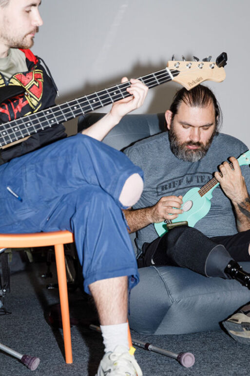 Zwei Musiker sind an diesem Nachmittag als Freiwillige vorbeigekommen. Sie reißen Witze, geben kleine Anweisungen. Den Finger hier, die Hand locker halten, nur einen Akkord, dann vielleicht noch einen. Alles darf, nichts muss. In einer Ecke probiert ein Veteran kurz eine Ukulele aus. Ein anderer stellt mit seiner Krücke en passant etwas am Verstärker um, als wäre es das selbstverständlichste der Welt.