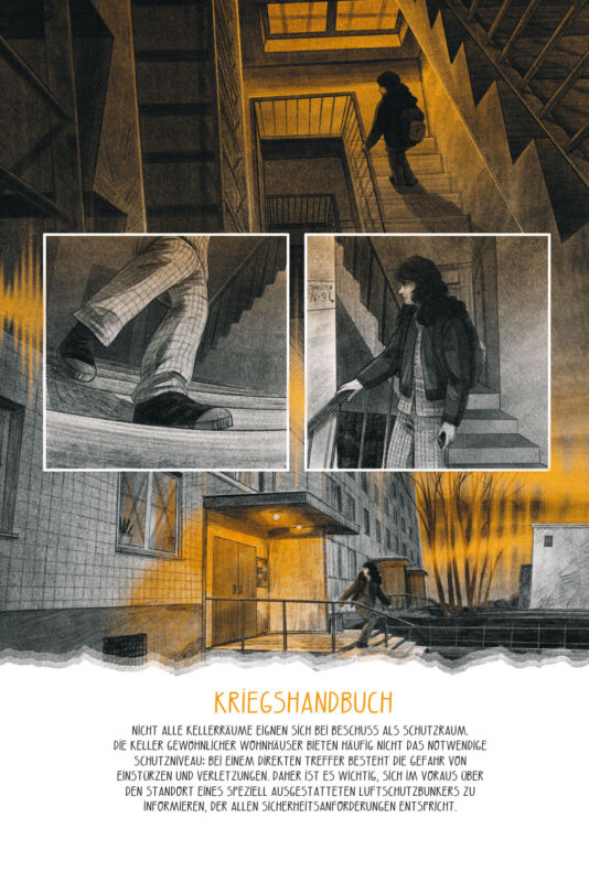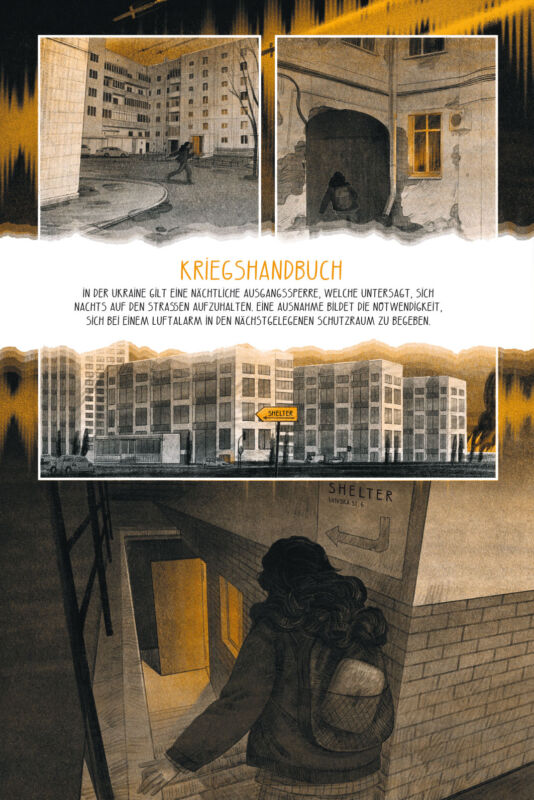 Doch wie verhält man sich in solchen Situationen? Wer nicht in den Luftschutzkeller gehen kann oder möchte, sollte dafür sorgen, dass sich zwischen ihm selbst und der Straße zumindest zwei Wände befinden – die erste, um die Druckwelle aufzufangen, die zweite, um die Splitter zurückzuhalten. Deshalb richtet sich Vika ein provisorisches Nachtlager im Flur ein und versucht weiterzuschlafen.