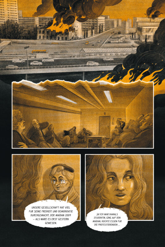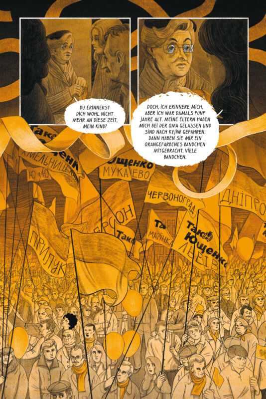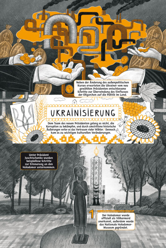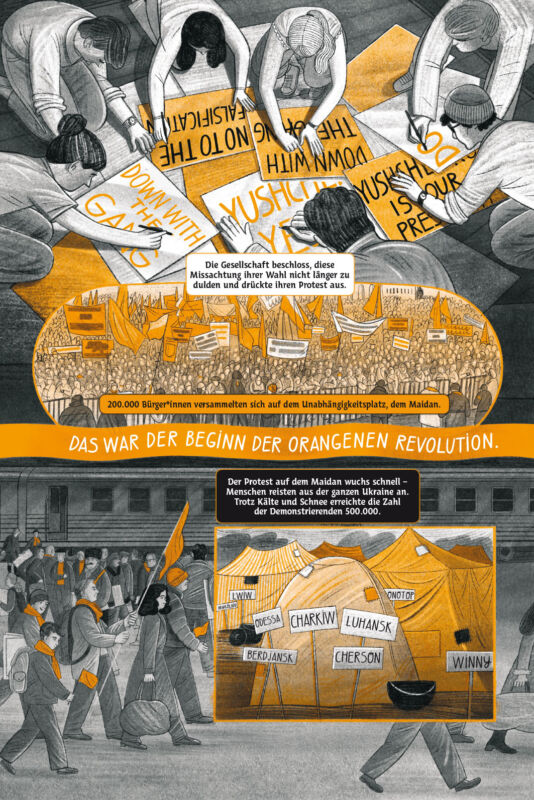Auch die jüngste Geschichte beleuchtet der Comic ausführlich, vor allem die beiden Maidan-Revolutionen – die Orangene Revolution 2004, die sich gegen Wahlfälschungen durch den prorussischen Kandidaten Wiktor Janukowitsch richtete, sowie die Revolution der Würde 2013 bis 2014, in deren Folge Janukowitsch abgesetzt wurde und nach Russland floh. Lange konnten die Ukrainer:innen diesen Sieg jedoch nicht auskosten, der russischen Führung war er ein Dorn im Auge. Im März 2014 annektierte Russland die Krim, wenig später begann es den Krieg im Osten des Landes in den Regionen Luhansk und Donezk.