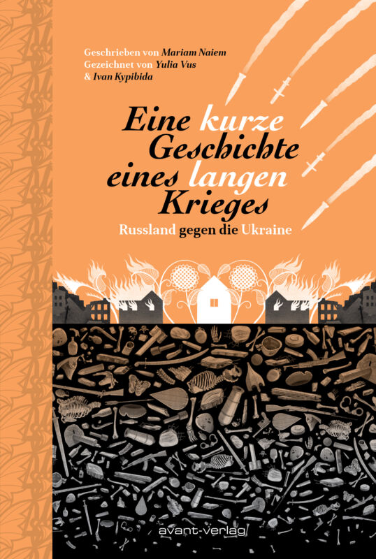 Mariam Naiem, Yulia Vus, Ivan Kypibida, „Eine kurze Geschichte eines langen Krieges“, avant-verlag, Berlin 2025, 104 Seiten, Flexcover, 25,00 Euro.